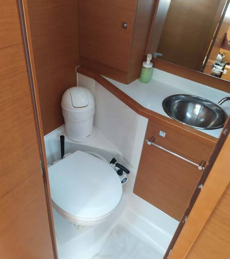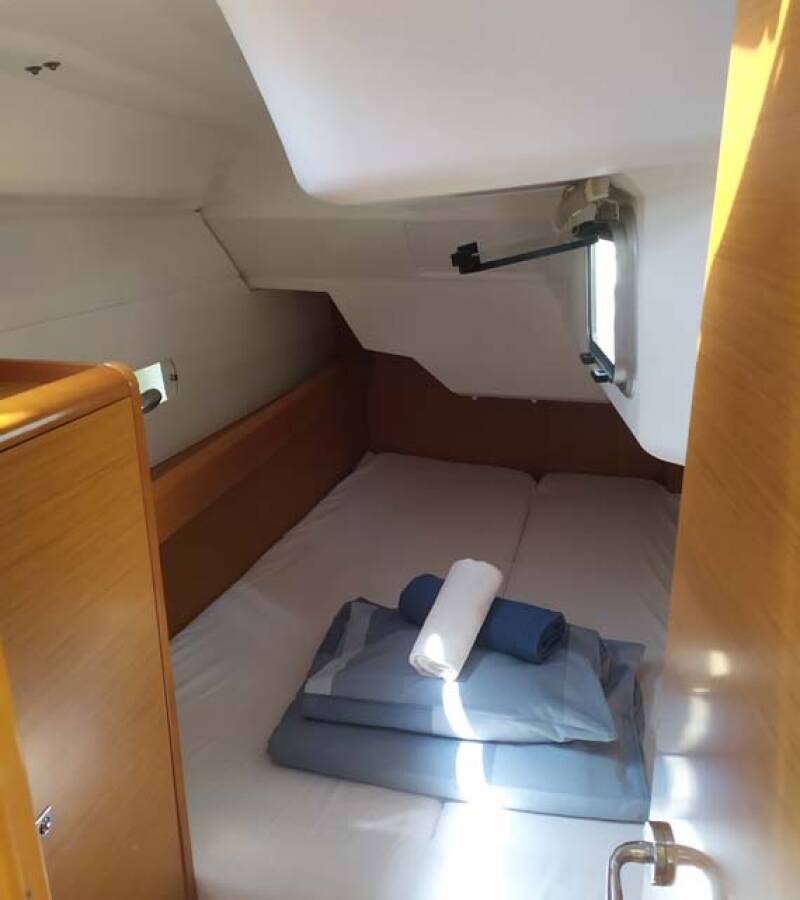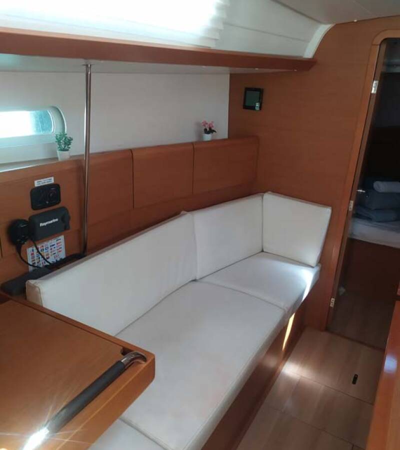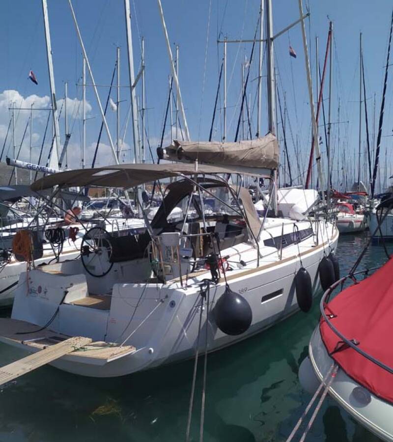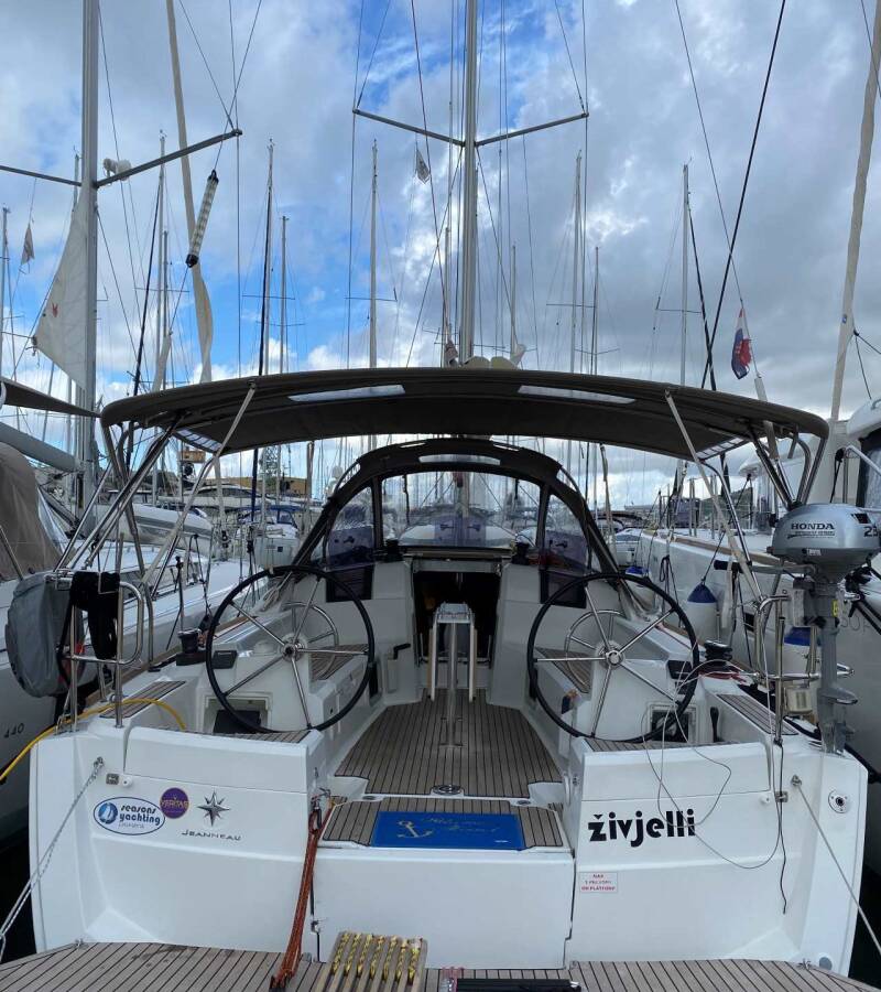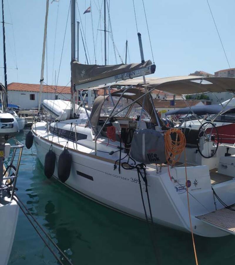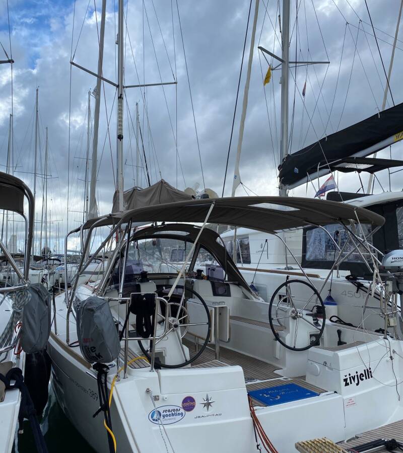 The Sun Odyssey 389 „živjelli“ is equipped with a mainsail and a genoa as well as a Bimini top, Autopilot, Sprayhood, Heating.
