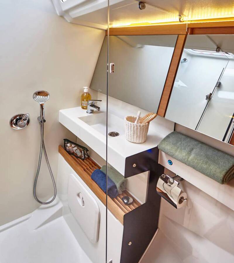 The Sun Odyssey 440 „Carlotta“ offers special comfort with the following equipment features: Bow thruster, Air Conditioning, Cockpit cushions, Bathing platform.