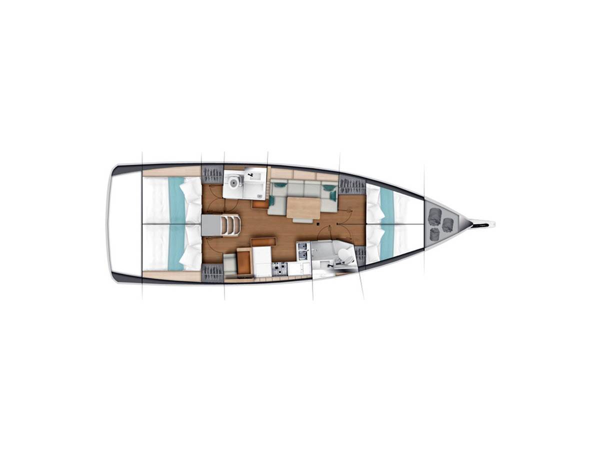 The Sun Odyssey 440 „La Baavca“ is equipped with a mainsail and a genoa as well as a Bimini top, Autopilot, Sprayhood, Heating, Teak cockpit.
