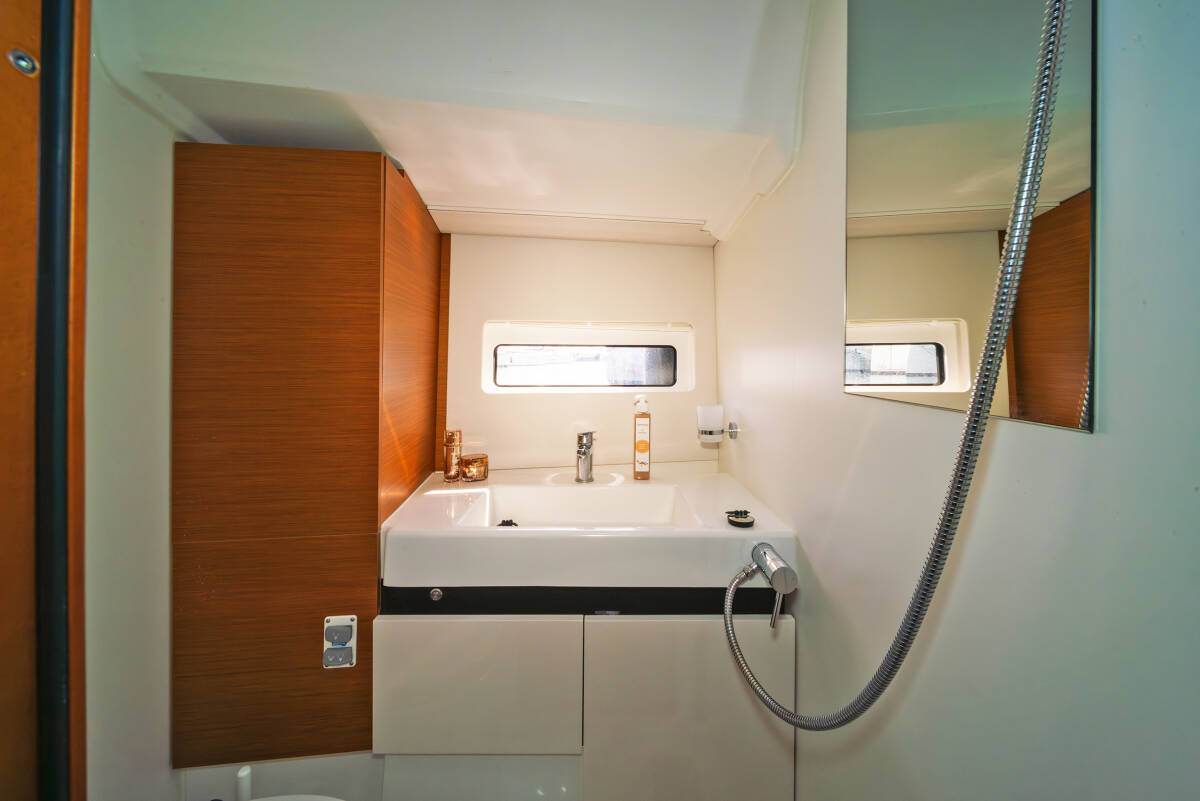 The Sun Odyssey 490 „CALICO JACK“ offers special comfort with the following equipment features: Bow thruster, Generator, Air Conditioning, Bathing platform, Electric toilet, Solar panels.