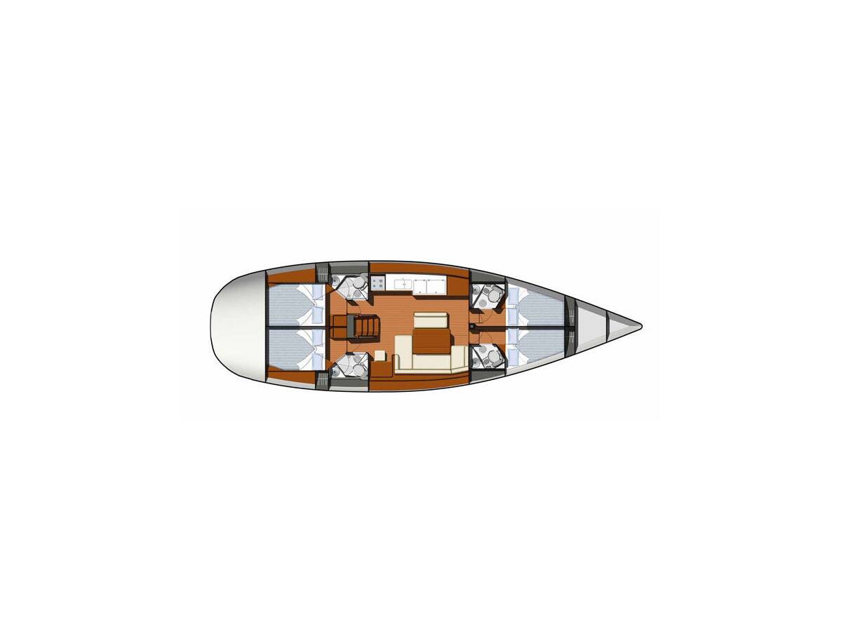 The Sun Odyssey 49i „“ is equipped with a mainsail and a genoa as well as a Bimini top, Autopilot, Sprayhood, Teak cockpit.
