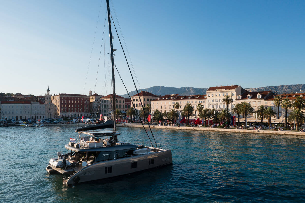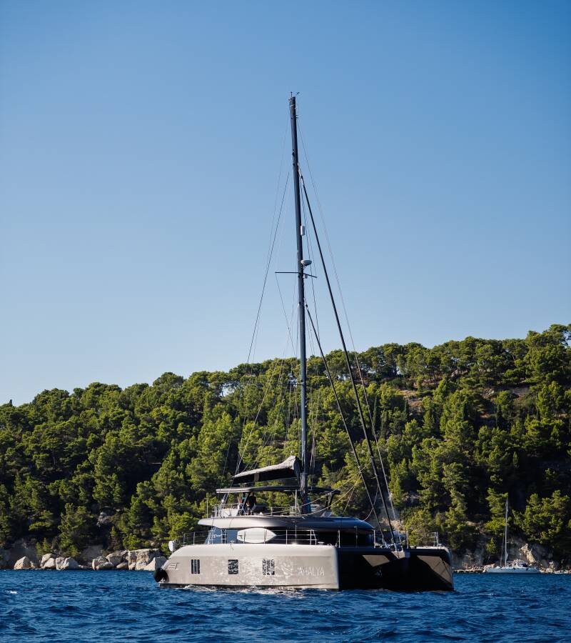 The Sunreef 60 „Ahalya“ is equipped with a mainsail and a genoa as well as a Radar, Bimini top, Autopilot, Sprayhood, Heating, Teak cockpit.
